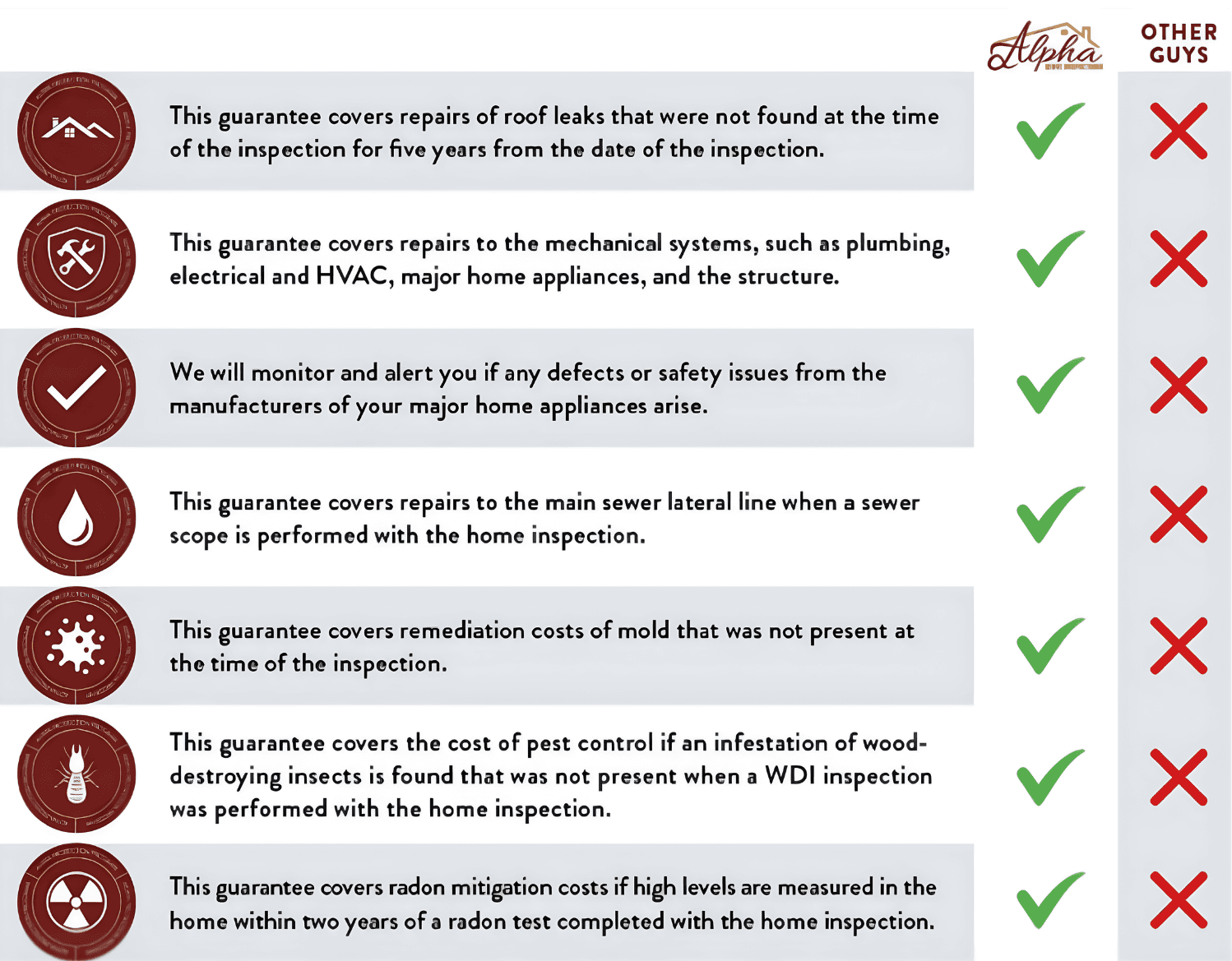 En Alpha Home Inspections, su protección no termina cuando finaliza la inspección. Cada comprador de vivienda que atendemos está respaldado por nuestro exclusivo Programa de Protección Alpha, una garantía integral diseñada para proteger su hogar, su inversión y su tranquilidad. Desde sistemas mecánicos y componentes estructurales hasta goteras en el techo, líneas de alcantarillado, moho, radón y más, nuestro programa ofrece verdadera cobertura donde los propietarios de viviendas más la necesitan.